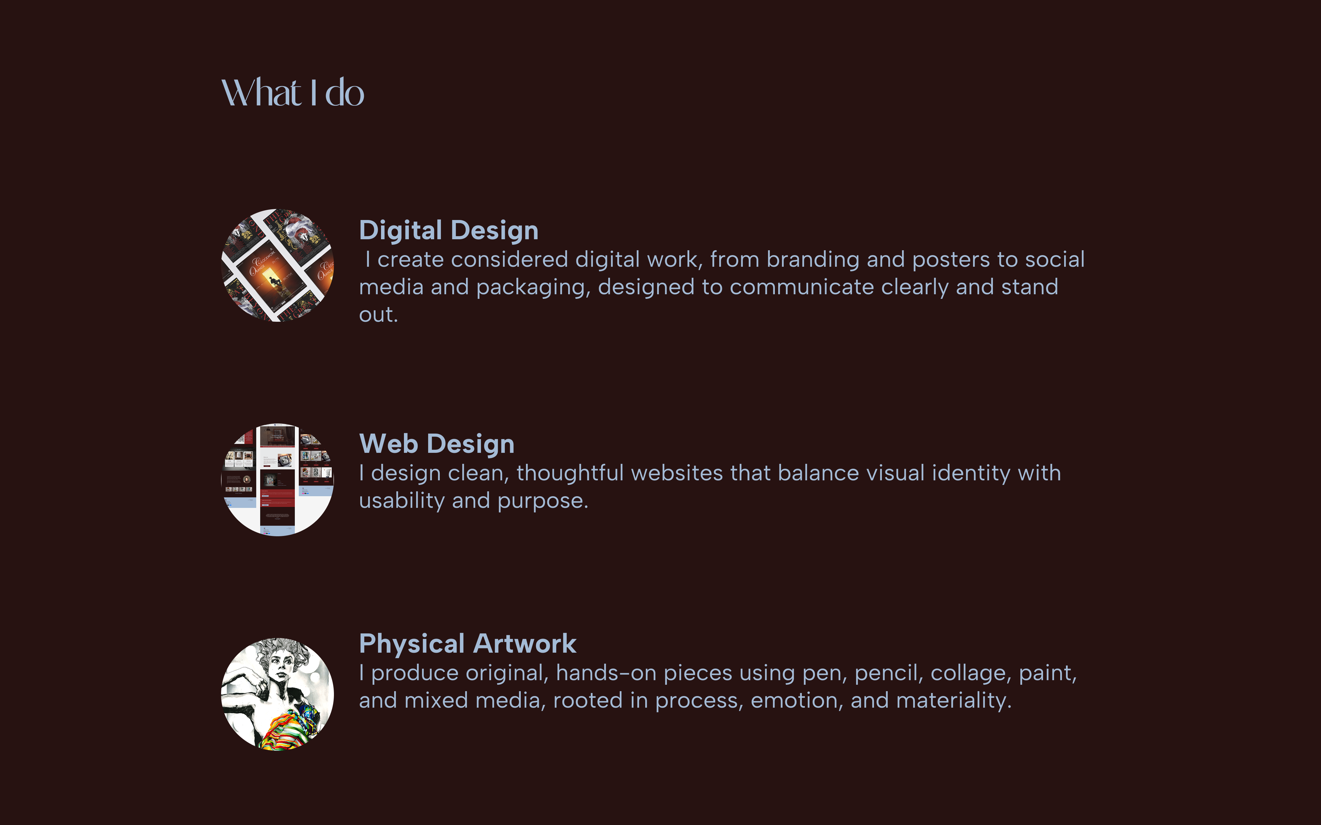 My work sits at the intersection of visual expression and purposeful communication; whether that’s through a brand identity, a website, personal art, or creative visuals.